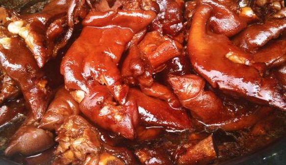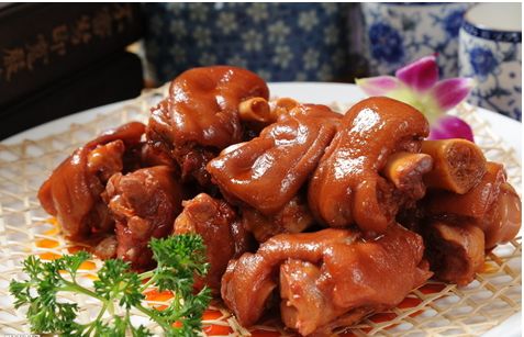 蘸着作料,一只只红润饱满,油光闪亮、香醇甘厚的卤汁猪蹄就这样被你瓦解成一粒粒猪骨,在双花醋的陪伴下,一段美好的时光就这样停歇在古镇上。