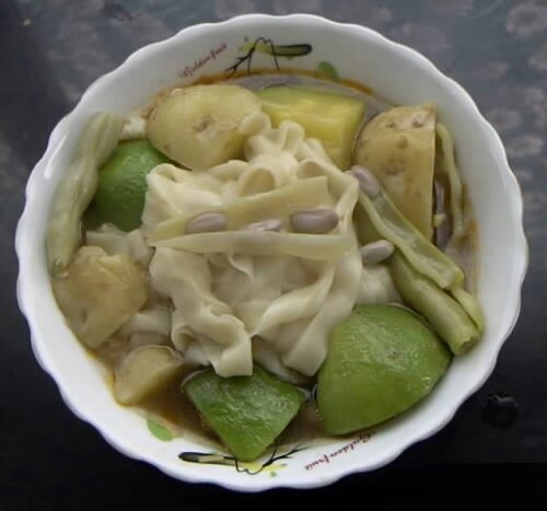 2,锅加清水烧开,先下四季豆、洋芋块煮五分钟,后下小瓜块煮再煮三分钟,然后把面条加入一起煮至面条熟后加盐、香油、味精即可食用。