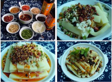 3.食用时用刀把米豆腐切成长6厘米、宽高各1厘米见方长条放入碗中,淋上红油,放上葱、姜、绿豆芽、炸花生米、炸黄豆、泡酸萝卜、黑大头菜、麻油、酱油、大蒜、醋、味精拌匀入味即可。