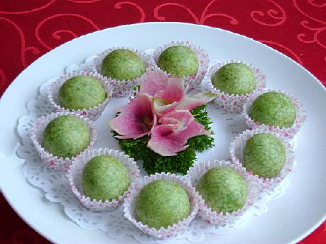糯米面200克,苏麻50克,芝麻50克,白糖50克,调合油200克(实用50克),菠菜汁适量。
