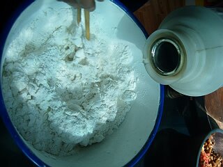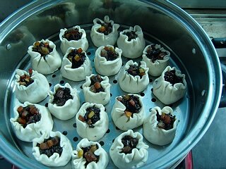 2,炒锅下花生油烧六成热下姜末炒香,下广味香肠、胡萝卜、香菇丁炒出油加入已蒸熟的黑糯米和适量清同炒片刻,加入精盐、味精、胡椒面调味制成烧麦馅。