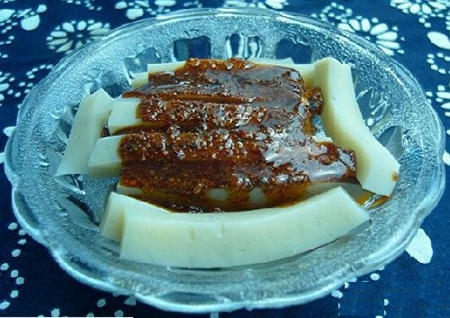 1.豌豆淘洗干净,浸泡4个小时,用磨磨成粉浆,用石灰水点后待其冷却成型,食用时切成细条状。