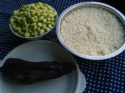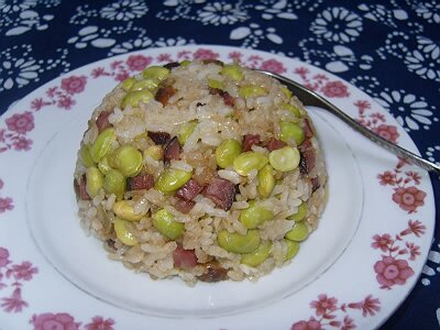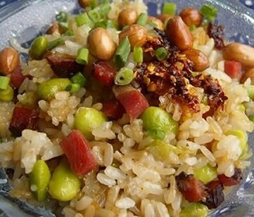 毕节青豆腊肉糯米饭用料:糯米750克,瘦腊肉200克,鲜青豆400克,花生油50克,精盐8克,酱油5克。