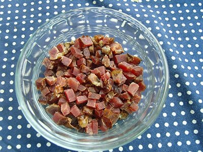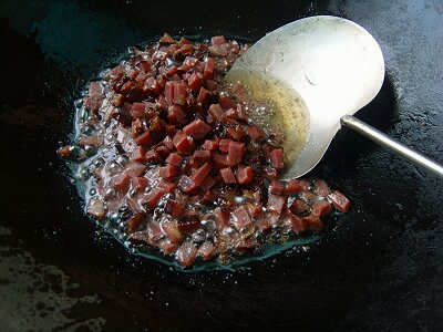 2,炒锅加油烧至5成热下腊肉丁炒1分钟,