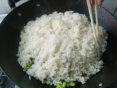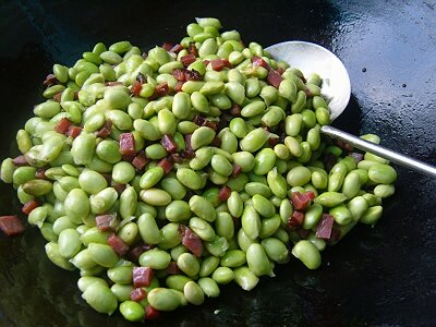 加入青豆同炒至青豆微微变色,