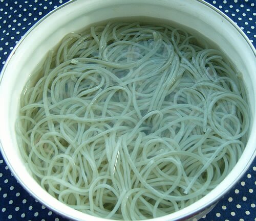 3.苕粉条下开水锅,待水再次烧开后离火盖上锅盖闷二十分钟,用凉水冲凉剁碎;