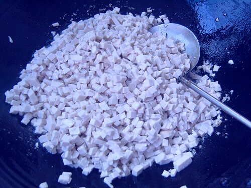 2.白豆腐切成碎颗粒下油锅炒制至熟,炒制时少加点盐,成熟后晾凉备用;