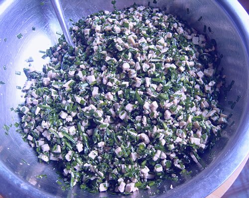 5.把豆腐、韭菜、粉条加盐、胡椒面、酱油、味精、花生油调匀成素馅;
