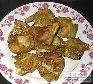 都匀鸡肉香煎馄饨:鸡肉馄饨平底锅煎熟来吃,由于鸡肉鲜嫩很容易煎熟,油煎馄饨具有馅鲜软嫩,外壳酥脆的特点,也不失为一种特别爽口的美味小吃。