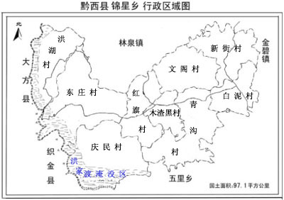 (黔南黔西县锦星镇) 锦星镇位于黔西县西南部,地理位置为东经105°45′30″~105°57′15″,北纬26°55′45″~27°15′20″之间,乡域从东到北依次与金碧镇、五里乡、织金县、大方县、林泉镇接壤,乡域南北宽7公里,东西长14公里,总面积97.1平方公里,耕地面积20183亩,其中田8664亩,辖9个行政村62个村民组,现有总户数7232户,共30729人,其中农业人口29909人,非农业人口820人,少数民族4878人。