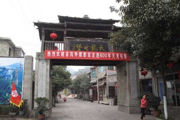 天龙镇,是黔南民俗旅游胜地之一,天龙镇曾是明太祖朱元璋军队迁徒屯兵之地,至今仍保持古扑厚重的明代遗风古俗。这里的天龙地戏演绎的是600年前杨家将、穆桂英等故事。戏剧粗犷、独特,耐人寻味,被世人和专业人士称为:“戏剧活化石”。演员头戴木雕傩戏脸壳,面遮黑纱,身穿长衫,肩插令旗,手持刀棍,或群舞或单搏,透露出英勇顽强与善战克敌的精神。