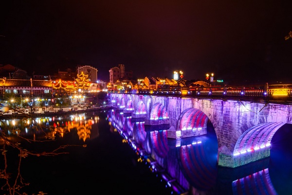 祝圣桥是古镇的地标,桥上有一座三层的亭子,这里曾是湘黔联通的主要通道,自古既有“湘黔咽喉”之称。每天晚上,祝圣桥上灯火通明,河水倒映着灯火,颇为壮观,无论是桥上闲逛还是拍照休闲都很适宜。