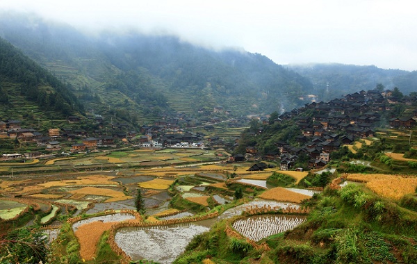 走到寨子的尽头是一片田园风光,即使旺季也很少有人来这一块。过河有去观景台的电瓶车站点,走去观景台吧,路并不长,一路上有几个点眺望风景的视野也是不错的。到达观景台,等候夜幕降临,西江的大戏才刚刚开始。千百盏灯火从木质吊脚楼的屋檐下亮起,星星点点,勾勒出整个苗寨的轮廓,是一个牛头的形状,很难想象一座大山里的寨子,有如此灯火通明的景象。清晨再次来到观景台,薄雾笼罩着苗寨,第一缕阳光将木头房子渡成金色,炊烟袅袅升起,新的一天又开始了。
