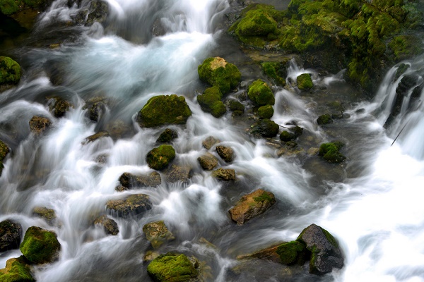 暗河从崖底涌出,潭面上不见踪影,只见卧龙坝雪崩似的滚水瀑布,潭外流淌不息的渠水,才感到卧龙河在潭底翻动。
