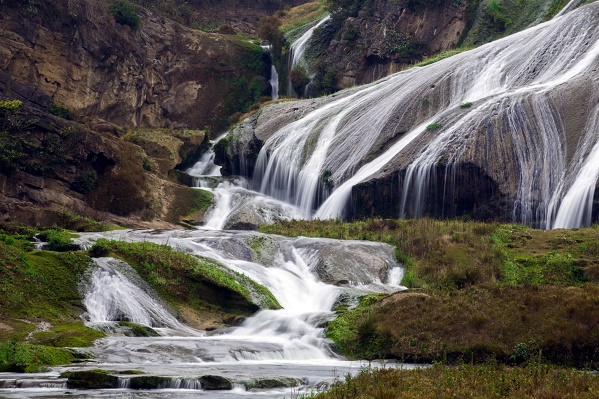 陡坡塘瀑布有两面,当平水期的时候,因为上游白水河水量较小,水流清澈,陡坡塘瀑布缓缓的洒下,清秀妩媚如一层面纱,被戏称为:新娘面纱。