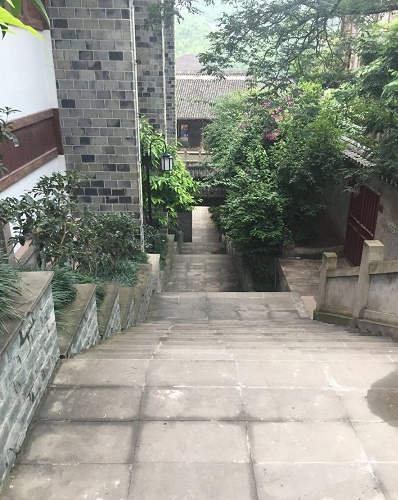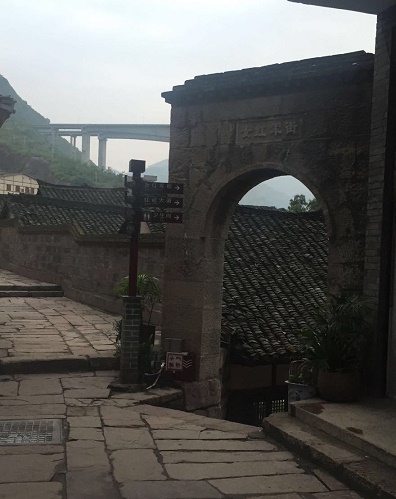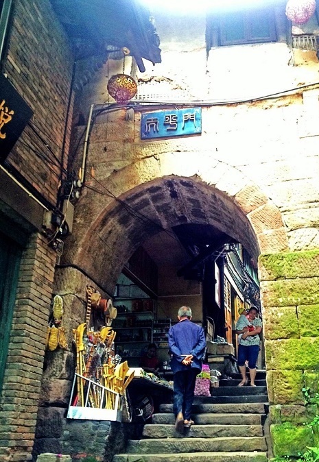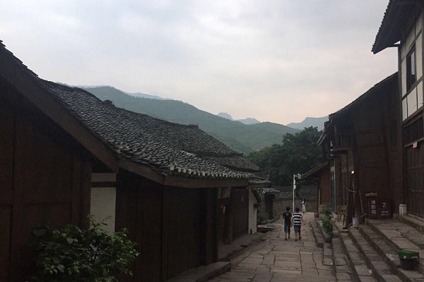 古镇距河滩10余米高,两座石门把守着东西场口。门旁各有一株苍劲古朴的大黄桷树。