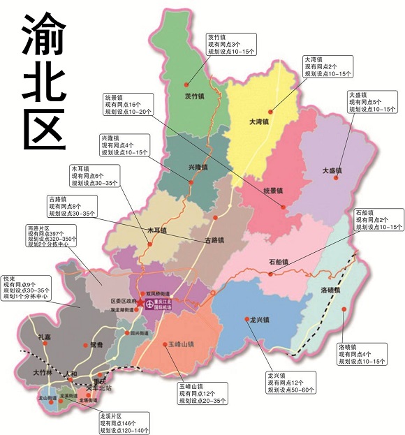 渝北区东邻长寿区、南与江北区毗邻,同巴南区、南岸区、沙坪坝区隔江相望,西连北碚区、合川区,北接四川省广安市华蓥市,幅员面积1452.03k㎡。截至2017年,渝北区辖19个街道、11个镇, 常住人口163.23万人。